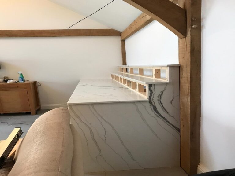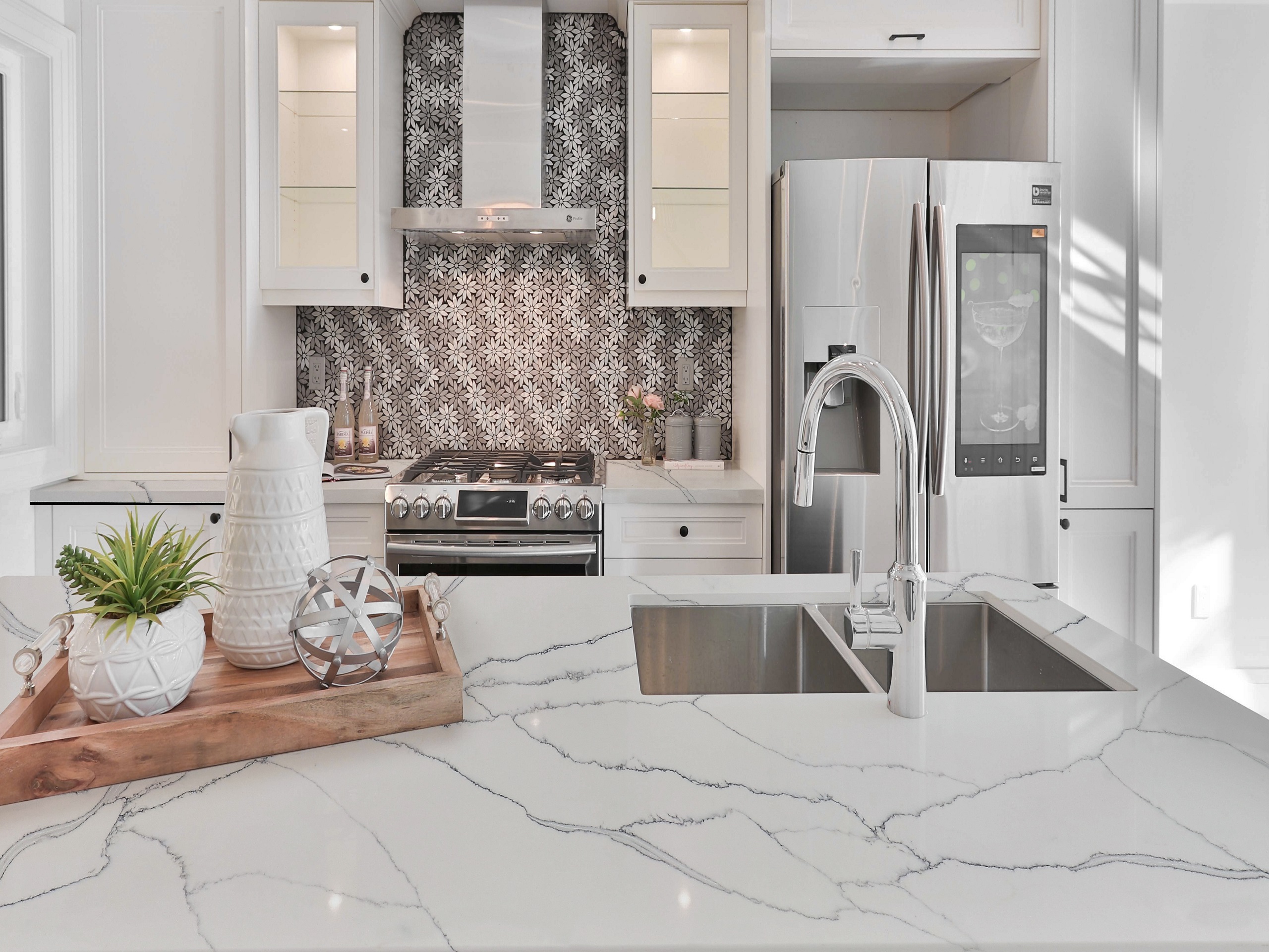 Monaco is an elegant looking quartz posing a strong white background with thin grey veins along with a polished finish. It has a genuine Carrara Marble look and feel. Monaco Carrera is an incredibly beautiful marble effect quartz. It is rated as the best Carrara marble.