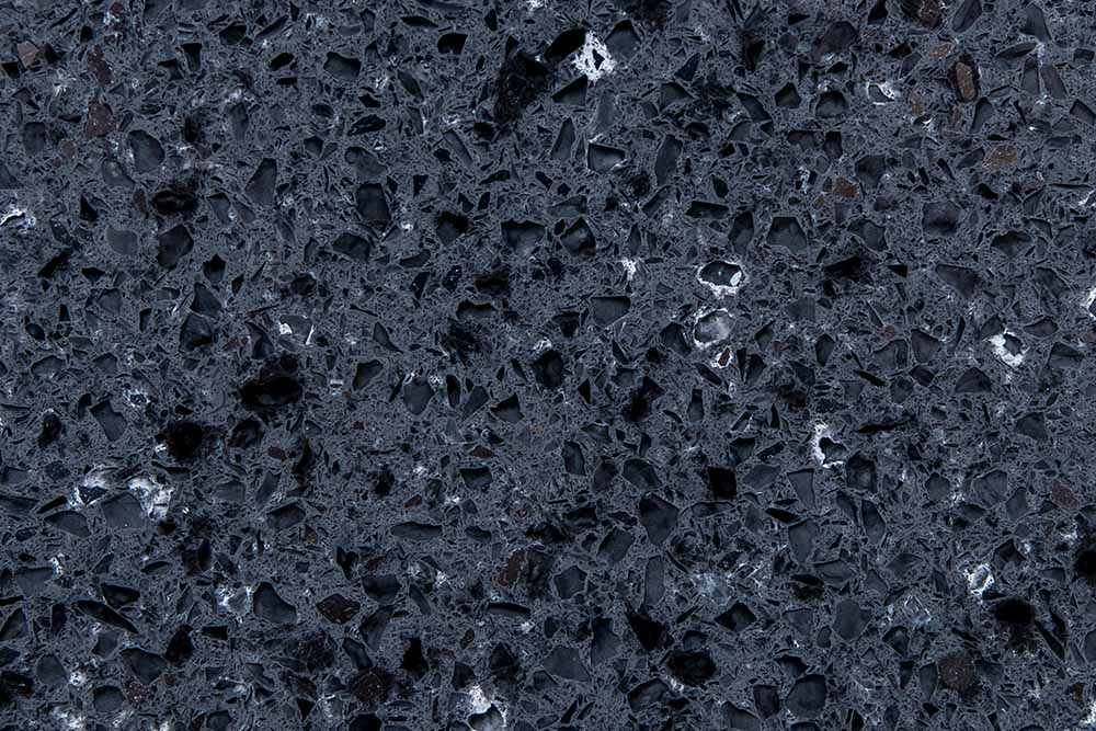 Platino Gris Noir Quartz has a moderately dark coloured grey base to the slab combining sparkle with varied sizes of recycled Glass along with dark grey to black glass chippings all over the slab. It can be matched with most modern coloured cabinets in the Kitchen, but offering good contrast mainly with white glossy and matt door cabinets. Can be widely used in Bathrooms too both in Residential and Commercial industries.
